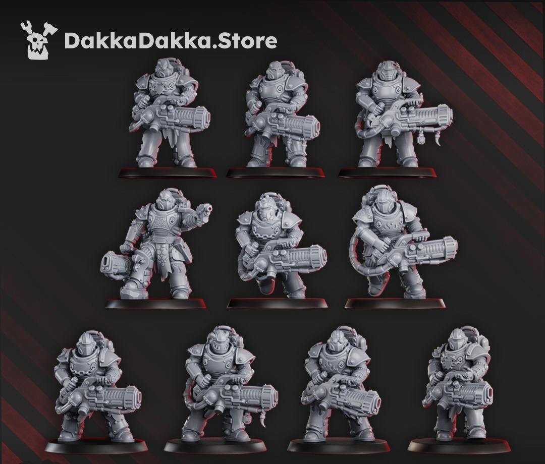 DakkaDakka miniatures are printed in 32mm scale. Scenic bases are provided when pictured, plain black bases are not provided.